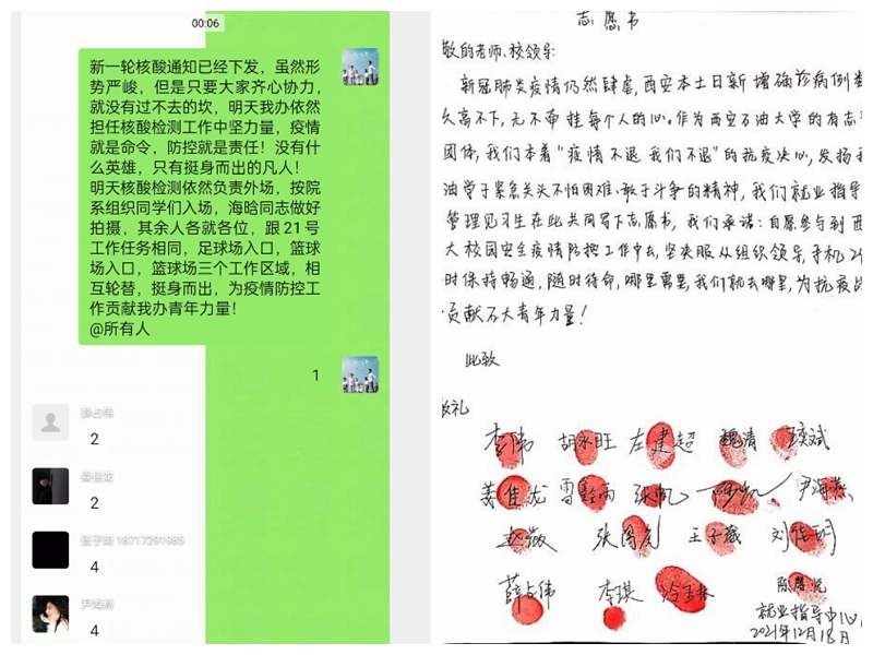 大“疫”面前,人人有责,人人尽责。在众多的学生志愿者中,由学生工作部(处)就业指导中心组织的18名大学生管理见习生志愿者分外抢眼。无论是在凌晨、还是深夜,他们24小时待命,随时集结。在鄠邑校区全员核酸检测的现场,每次都有他们忙碌的身影,往往是连续奋战10几个小时。他们秉持“团结、务实、认真、高效”理念,敢于冲锋、敢于斗争、敢于胜利,锻造出坚如磐石、舍生忘己、心怀众“生”的可贵品质。