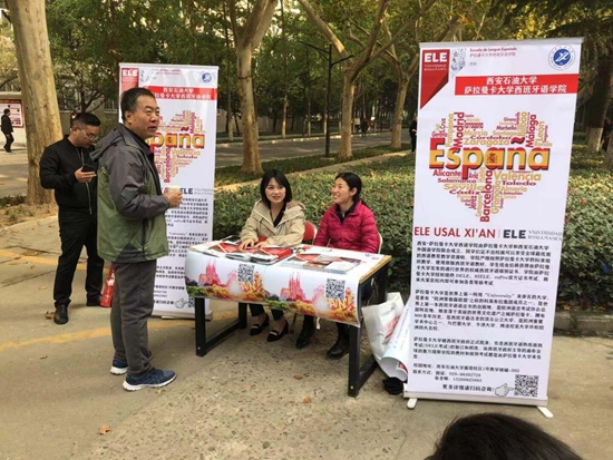 (西班牙语教师赵雨菡、意大利语教师张雨青在bat365进行萨拉曼卡大学西语学院招生宣传工作)